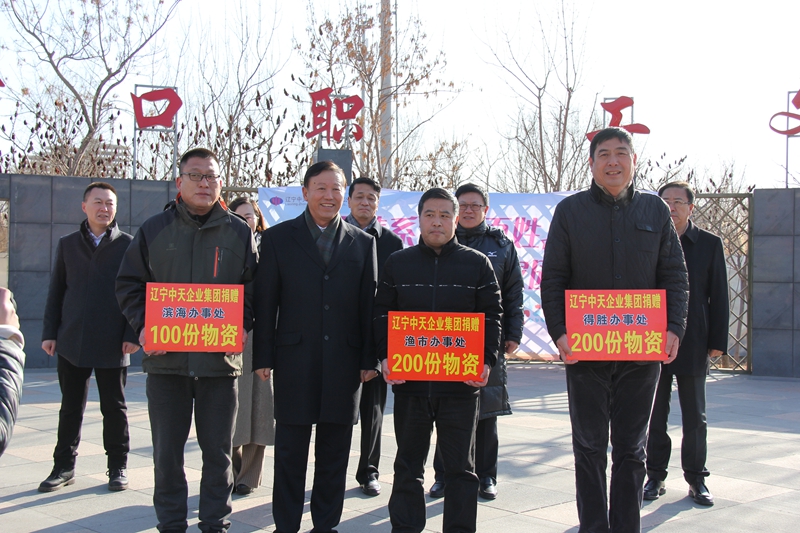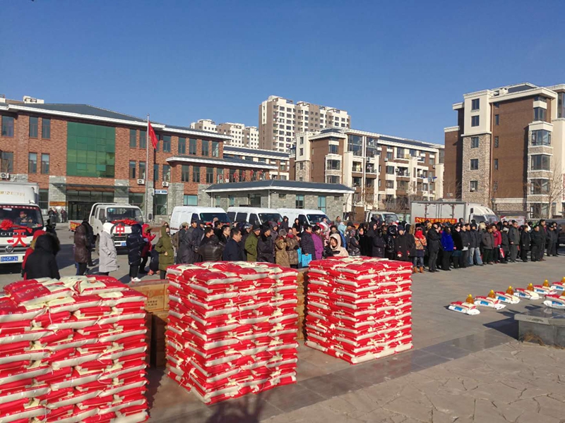 2018年1月23日,满载大米、面粉和豆油的八辆大卡车,在集团于宝权董事长带领下,直赴营口市西市区得胜街道红运社区广场,为等候在这里的500户贫困居民每户发放一袋大米、一袋面粉和一桶豆油,表达中天人的爱心,这是中天集团持续九年的善举。