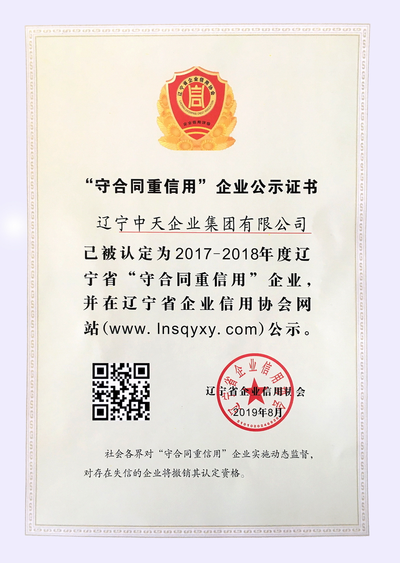 企业在追求自身发展的同时,自觉承担社会责任,主动纳税,截止2019年12月31日,集团全年纳税11667万元,上交社会保险金额256.64万元,对地方财政增收贡献了力量,连续多年成为区、市纳税明星企业。8月,被辽宁省企业信用协会评为“守合同重信用”企业,这是中天集团连续15年蝉联此项殊荣。