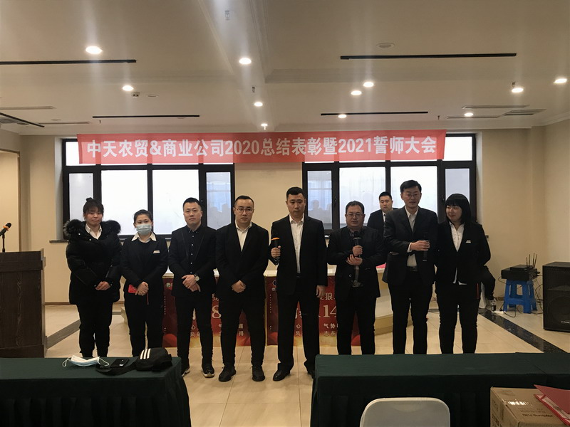1月28日下午,农贸和商业公司召开2020年度总结表彰大会。商业公司副总经理田彧做商业公司2020年度工作汇报。表彰2020年度优秀员工农贸公司和商业公司团队上台,对新年度指标任务开展誓师。孙晶总经理分别与各位经理签署责任状,并发表讲话。通过此次会议,使农贸公司和商业公司的员工进一步明确了2021年度工作目标,提升了员工凝聚力,为更好的完成年度任务奠定了基础。