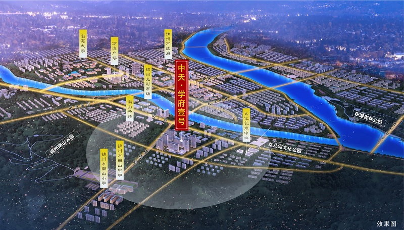 项目依山傍水,位于锦州城市东侧,北朝女儿河,南临南山公园,距离万达广场、市府广场、实验学校、东湖森林公园等生活商业配套3公里左右,项目周围生态良好、生活安静,是未来锦州置业的优选地段。项目通过西侧主入口步入式大堂进入小区,高层建筑楼间距较大,有利于形成较为集中的景观节点。地块南临二级道路,沿街配有商业,适合形成具有体验感的商业景观。