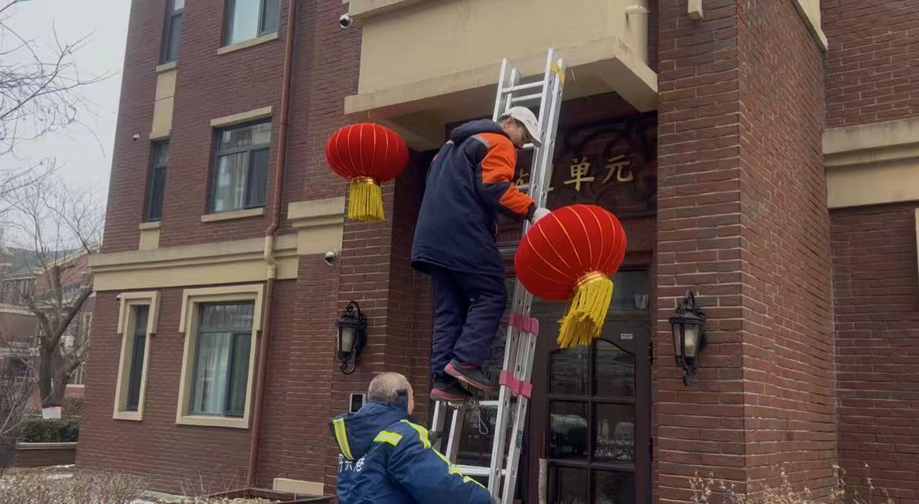 在小区个单元楼宇门前,物业工作人员正分工协作进行装饰作业。有人登上铝合金梯子,将大红灯笼的挂钩牢牢固定在建筑构件上,艳红的灯笼搭配金黄流苏,瞬间点亮了建筑门头;与此同时,另一组工作人员同步布设彩灯串,将五彩灯带缠绕在楼宇装饰柱、绿植枝干上,与红灯笼相互映衬,让节日的视觉层次更丰富。