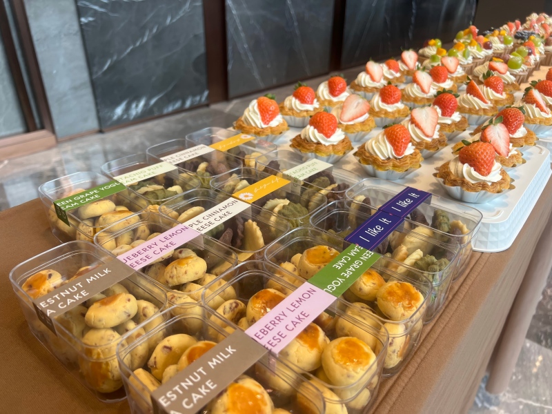 作为区域内的地标建筑,中天云璟此次活动的筹备,精准踩中了职场人的“年末节奏”:物业团队提前准备了不易影响办公的轻食甜品——刚出炉的曲奇裹着黄油香,纸杯蛋糕点缀着新鲜果粒;奶茶则调试至“适口不烫”的温度,搭配便携包装,方便员工带回工位享用。活动现场,工作人员身着整洁工装、佩戴无菌手套,将甜品逐一分装——金黄的曲奇在托盘里码得整齐,与写字楼现代简约的大堂风格相映,既保持商务场景的整洁质感,又藏着细节里的温柔。