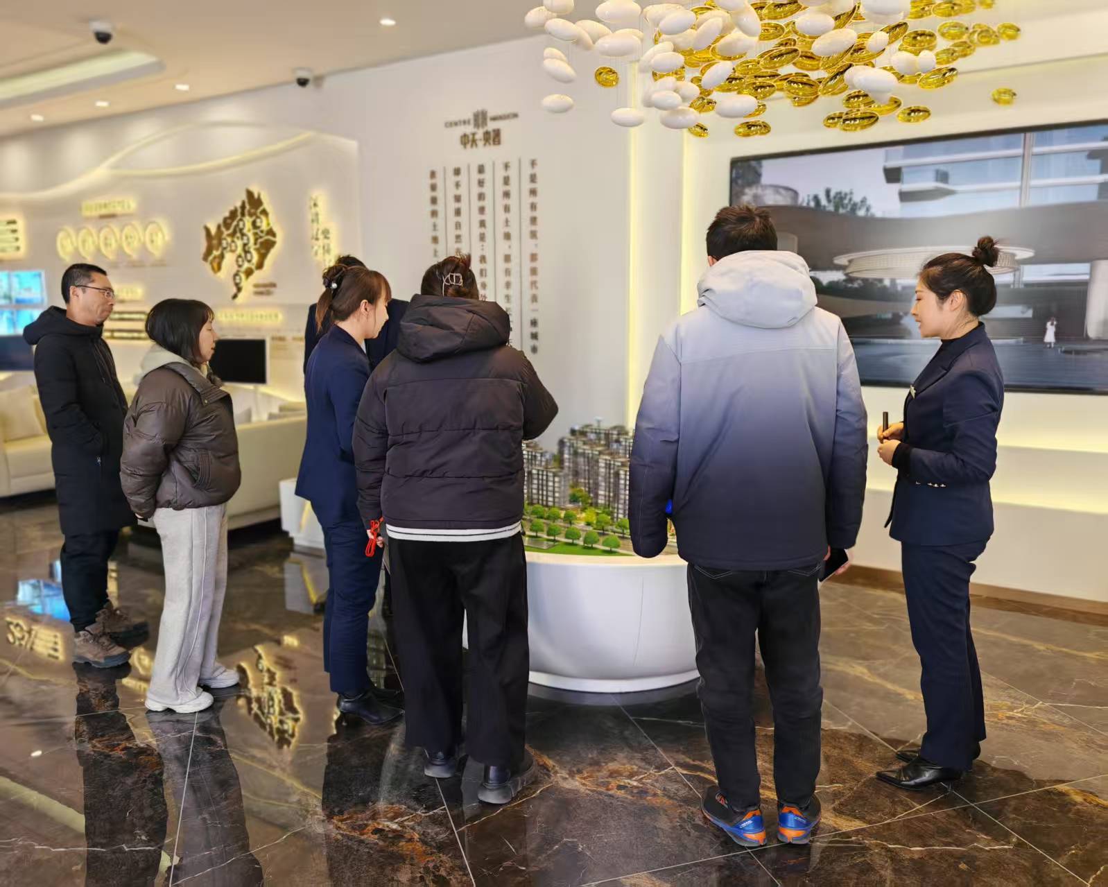 沙盘展示区人头涌动,置业顾问的专业讲解声与客户的热烈咨询声交织成热闹的交响。全景沙盘以1:165的精细比例,生动呈现“一轴一环六园三公园”的景观布局——中央景观轴串联社区核心,环形健康步道串联六大主题花园,更无缝衔接三大市政公园,完整还原了项目在高端生活营造上的独具匠心。