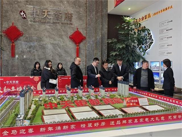 刘局长一行实地参观了中天华府的项目现场,认真听取了徐强总经理关于项目整体介绍、建设进展及未来发展方向的详细汇报。2025年中天华府销售业绩斐然,凭借优质的产品品质和完善的配套服务广受市场认可,依托此良好态势,中天集团在辽宁省商品住宅销售面积中位居第三;2026年开年以来,项目延续热销势头,实现开门红。