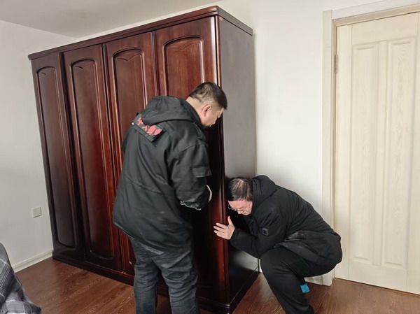 这套衣柜体积庞大,分量更是格外沉重,业主独自一人根本无法挪动,心急之下,第一时间想到了小区管家,抱着试一试的心态求助,希望管家能帮忙将衣柜搬离危险区域。得知业主的难处,管家没有丝毫犹豫,立刻放下手头工作,第一时间赶到业主家中。