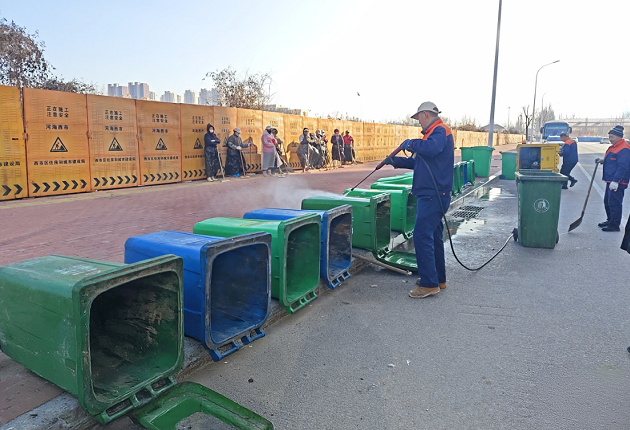 清洗现场,保洁人员分工协作、有条不紊。大家先将垃圾桶内残余垃圾清理干净,再逐一将垃圾桶拖至指定区域,使用高压水枪对桶身、桶盖、底部及边角进行全方位冲洗,强力去除附着的油污与顽固污渍。针对难以清理的死角,保洁师傅们手持刷子反复刷洗,确保每一处细节都洁净如新。冲洗完成后,工作人员还对垃圾桶进行了全面消毒,有效杀灭残留病菌,最后将清洗消毒后的垃圾桶整齐归位,整个流程规范有序。