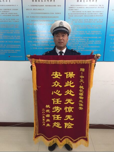 日前,业主为了感谢周班长等保安这种负责精神,特意制作了一面锦旗,上书:“保此处无惊无险,安众心任劳任怨。”称赞桃花源物业人员的高尚品德。高品质服务,送来锦旗一面,醒目的两行字这是对我物业的工作给予的高度的肯定。
