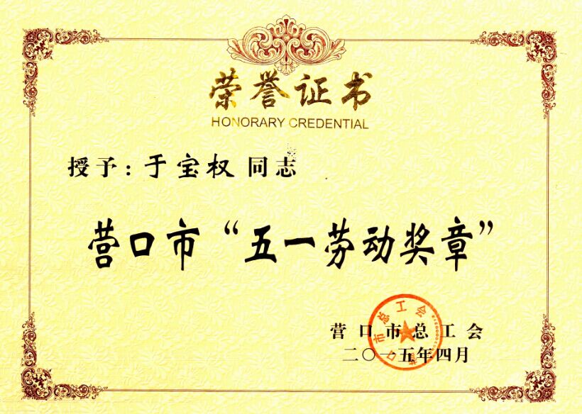 在五一国际劳动节来临之际, 4月28日上午,市总工会召开的2015年营口市“五一劳动奖状”和“五一劳动奖章”表彰大会上,于宝权董事长荣获“市五一劳动奖章”殊荣;4月29日上午,在站前区政府召开的“站前区劳动模范先进集体表彰会”上,于洪涛总经理荣获“站前区劳动模范”殊荣。所获得的殊荣是市政府、区政府对两位领导者多年来兢兢业业工作、不断奉献社会的称赞;也是对我们中天集团十四载风雨兼程,稳健发展的充分肯定。