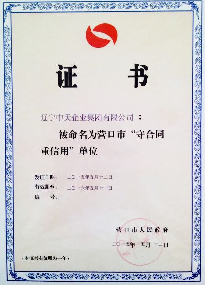 在激烈的市场竞争中,“诚信”是企业最大的品牌。中天集团自成立以来,始终注重加强企业的诚信建设,坚持诚信为本、信用至上的发展原则,用诚信打动客户、用诚信赢得市场,打造“诚信中天”的企业品牌。2015年,集团再次被评为市“守合同重信用”单位,这是中天集团多年来一直坚持守合同重信用工作,以诚信推动企业发展的结果;是对中天集团全体员工日常点点滴滴辛勤工作的温情回报;更是社会各界对中天集团持续、稳健发展的充分认可与赞扬。