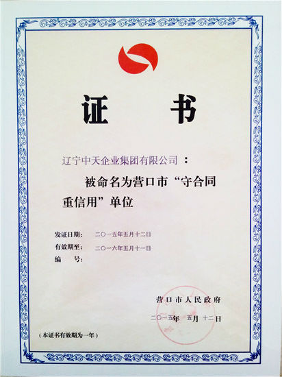 10、集团连续11年荣获“守合同重信用”单位荣誉称号。5月20日,集团再次被评为市“守合同重信用”单位,这是集团连续十一年获此殊荣。这既是中天集团多年来一直坚持守合同重信用工作,以诚信推动企业发展的结果;又是对中天集团全体员工日常点点滴滴辛勤工作的温情回报;更是社会各界对中天集团持续、稳健发展的充分认可与赞扬。