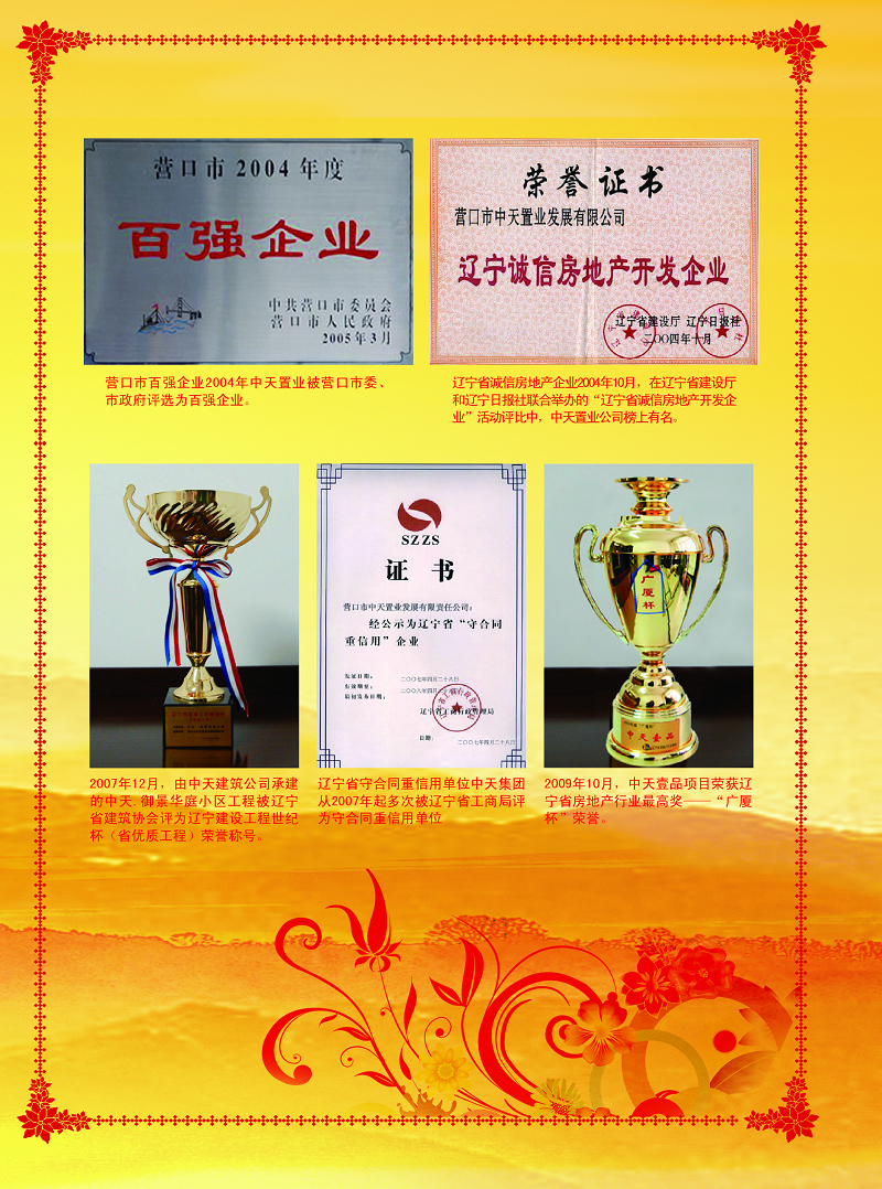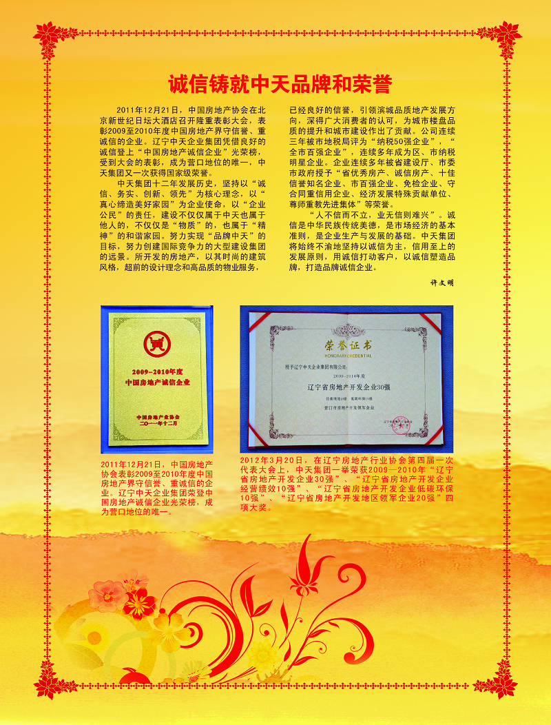 中天集团连续十三载荣获“市守合同重信用”企业荣誉称号。“诚实守信”是一个企业在激烈的市场竞争中保持旺盛生命力和竞争力的根本,是建立市场经济秩序的基石,是企业可持续长远稳健发展的保障。中天集团成立至今,已建立起自身独特的“诚信机制”,对业主说到做到,对客户说到做到,与主管政府部门领导说到做到,严格按合同履行各项责任与义务,“共赢互利、信守承诺”得到了社会各界的一致认可与好评,集团也走出了属于中天特色的发展之路。