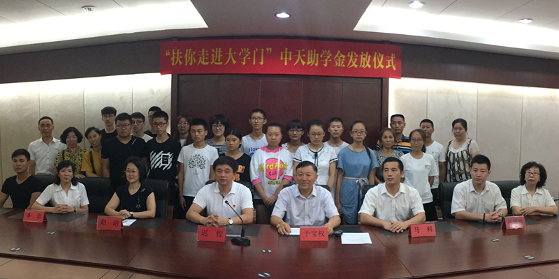 2017年8月11日上午,营口市希望工程扶你走进大学门之“中天助学金”发放仪式在中天集团总部会议室举行。中天集团董事长于宝权、共青团营口市委书记迟程、营口市希望工程办公室主任赵洁等领导出席了本次发放仪式。来自省实验营口分校、营口市第三高级中学、大石桥市高级中学、大石桥市第二高级中学以及盖州市第一高级中学的16名贫困学生每人从于宝权董事长手中领到5000元捐助资金,解决了他们的入学费用,圆了他们的大学梦。