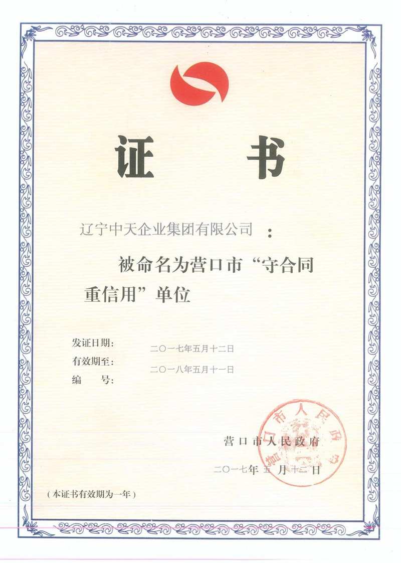集团连续十三载荣获“守合同重信用”企业荣誉称号。中天集团成立至今,已建立起自身独特的“诚信机制”,对业主说到做到,对客户说到做到,与主管政府部门领导说到做到,严格按合同履行各项责任与义务,“共赢互利、信守承诺”得到了社会各界的一致认可与好评,集团也走出了属于中天特色的发展之路。连续十三年获此殊荣,不仅是集团恪守诚信、规范经营的有力印证,也是对中天优秀品牌信誉建设成果的充分肯定。
