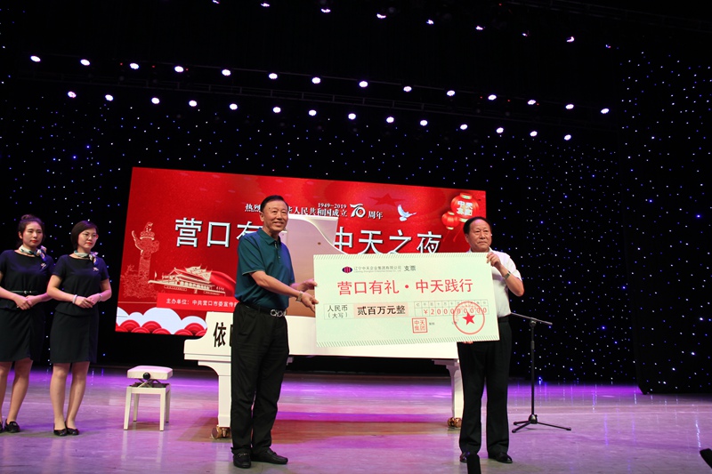为纪念中华人民共和国成立70周年,9月9日晚,中天集团携手中共营口市委宣传部,在辽河大剧院共同举行“营口有礼·中天之夜”红色经典系列音乐会。活动当晚,集团董事长于宝权向营口市慈善总会捐赠200万元,用做“营口有礼”专项基金。营口市委常委、市委秘书长王百胜,市委常委、宣传部部长肖力,市人大常委会副主任徐启,副市长金莉,市政协副主席马春山,集团董事长于宝权,总经理于洪波,西市区区委、区人大、区政府、区政协等领导及首届礼德榜样代表,与集团员工和业主代表等近千人共飨音乐盛宴,践行“雷锋精神,营口有礼”。