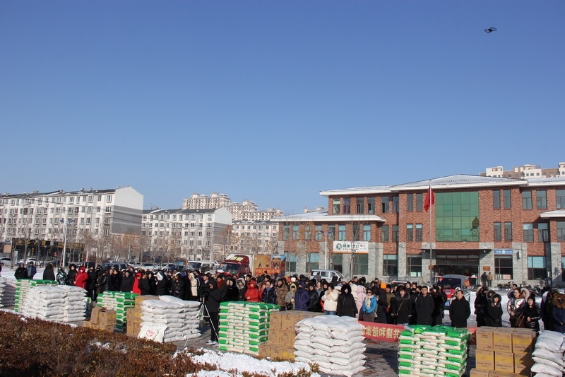于宝权董事长分别向区委组织部、得胜办事处、五台子办事处、清华办事处、渔市办事处和滨海办事处6个单位每个单位100户贫困家庭发放物资,共计送去600份物资,每户一袋大米、一袋面粉和一桶豆油。