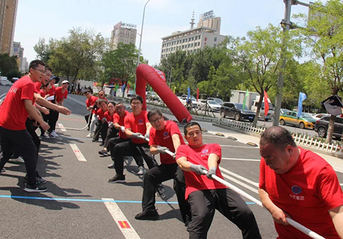 首先进行的是拔河比赛,各代表队分别派出10名选手参赛。随着裁判员哨音响起,锣鼓声、呐喊声响成一片,每一组比赛都在愉快的笑声和遗憾声中结束。经过激烈角逐,酒店公司和物业公司进入了最后的决赛。酒店公司已经蝉联三届拔河比赛的冠军,物业公司的实力也是非常强劲,在一片呐喊和力量的较量后,最后,物业公司打败了三届冠军酒店公司,取得拔河赛冠军。