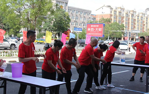 “运水接力”每队6人,队员一字排开,由左侧排头从放置水的桌子上,用两个空纸杯盛满水,依次传递给下名队员,传递至右侧排尾后倒入带计量的空杯内,再将空杯返回至排头重新装水,直至将空容器内的水装到规定水位。此项比赛考验的是队员的配合和稳定,不能一味追求速度,一次运输中能将更多的水倒进计量杯才是取胜的关键。集团机关通过默契的配合,取得了该项比赛的第一,辽阳公司和农贸商业公司分获二、三名。