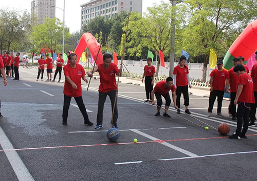 “赶猪跑”每队6人,在跑道内第1名队员用竹竿同时赶篮球和网球至第2名队员定点位置,依次传递至最后终点。球体不允许超出赛道,超赛道的从阶段内定点位置重新赶球。此项比赛,如何能控制好球的前进方向和速度是关键,过于追求速度势必会导致重新开始。通过激烈的比拼,最终物业公司获得了此项比赛的第一,大连公司和酒店公司分获二、三名。