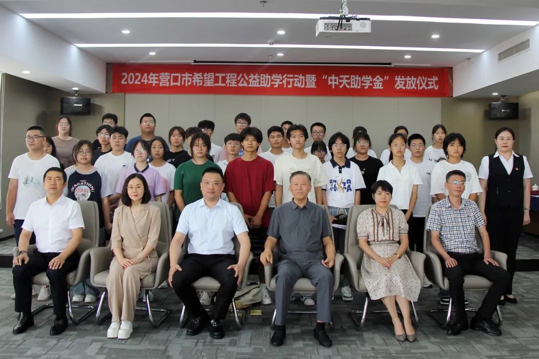 8月9日下午,2024年营口市希望工程公益助学活动暨“中天助学金”发放仪式在中天集团总部会议室举行。营口市团市委副书记(主持工作)刘庆男,中天企业集团董事长于宝权、总裁于洪波,营口市团市委副书记梁嫚,营口市招生考试委员会办公室主任崔玉琪,营口市慈善总会副会长黄渤以及获得资助的32名学生,出席了本次发放仪式。