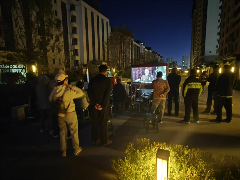 晚上为业主播放《大决战之辽沈战役》更是神来之笔。尽管夜晚带着丝丝凉意,但业主们的热情丝毫不减。大家围坐在一起,眼睛紧紧盯着屏幕,沉浸于那段波澜壮阔的历史当中。影片中宏大的战争场面、战士们英勇无畏的冲锋、战略决策的智慧较量,无不震撼着每一个人的心。业主们似乎穿越时空,感受到了解放战争时期的热血与艰辛,爱国情怀在心中进一步高涨。这种情怀让他们忘却了寒冷,只沉浸在对祖国伟大历程的自豪与感动之中。
