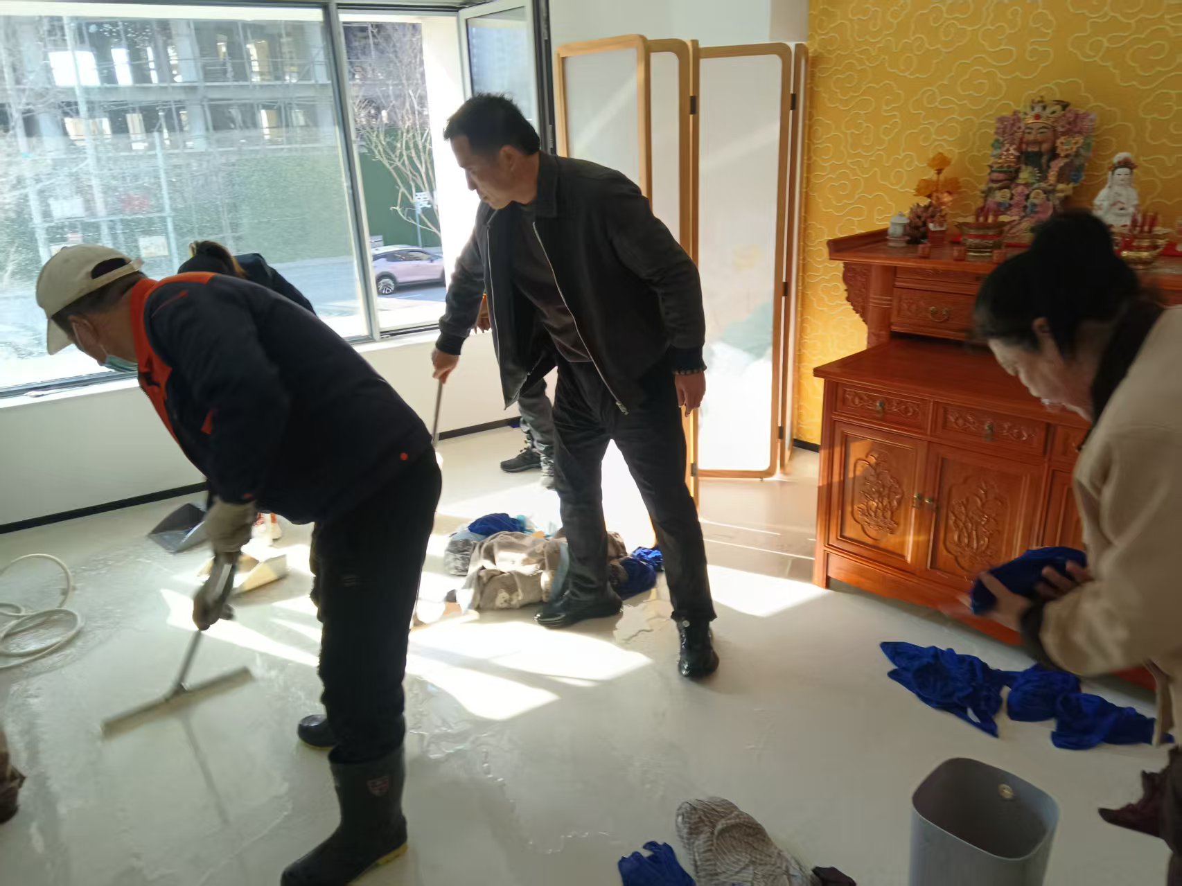 抢险现场,物业员工不顾衣物被水浸湿,默契配合、连续奋战,彻底清理店内积水,逐一擦拭地面与设备周边水渍,并协助商户检查受损情况,做好后续防护提醒。
